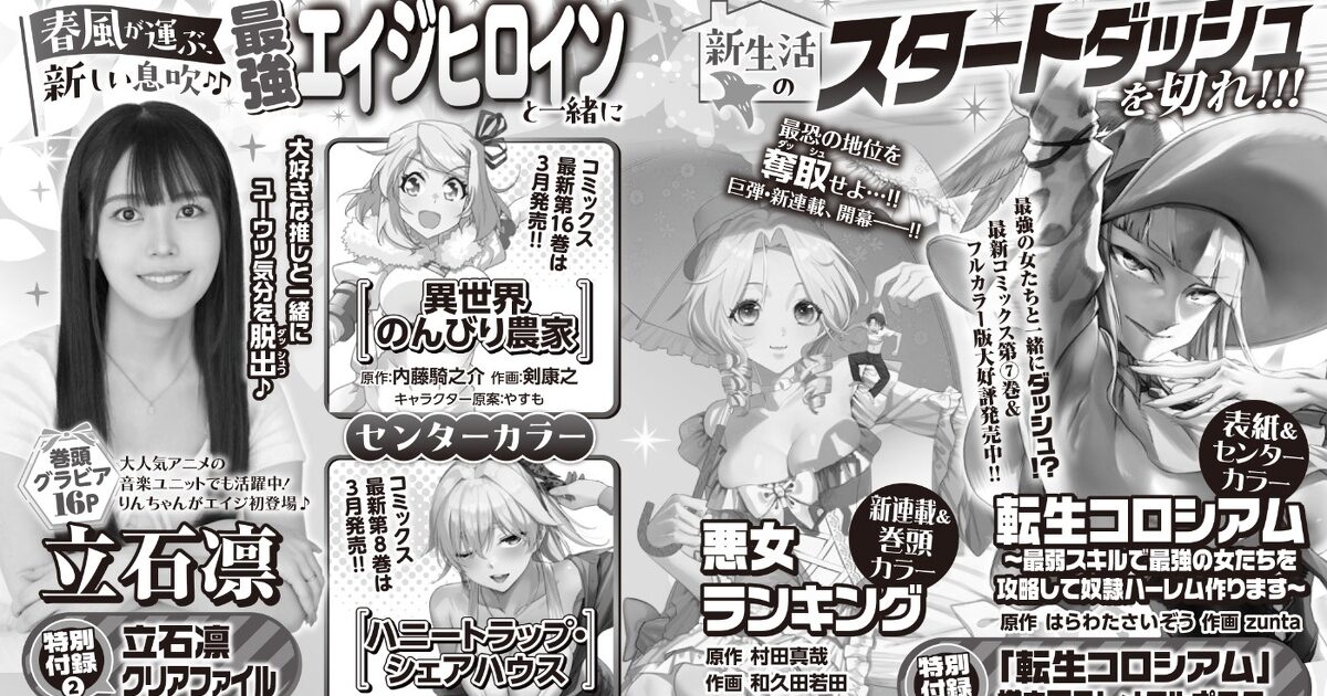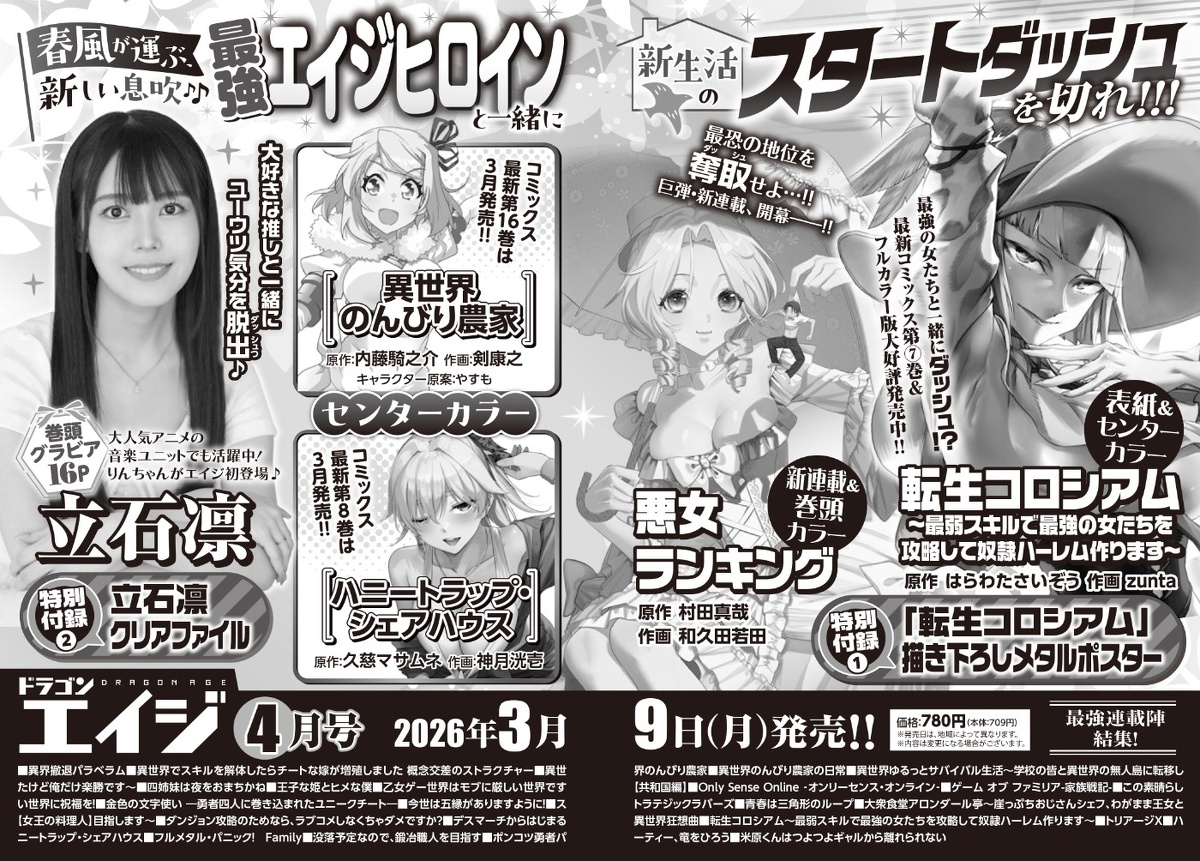 amazon.co.jp 【3/9発売】「月刊ドラゴンエイジ 2026年 4月号」グラビア:立石凛 ポストする シェアする LINEで送る 更新日 : 2026年2月21日(土) ドラゴンエイジ KADOKAWA 月刊(毎月9日) 公式サイト 公式SNS ▼バックナンバー検索 Amazon 楽天ブックス 楽天市場 月刊ドラゴンエイジ 2026年 4月号表紙『転生コロシアム ~最弱スキルで最強の女たちを攻略して奴隷ハーレム作ります~』原作:はらわたさいぞう / 作画:zunta巻頭グラビア立石凛大人気アニメの音楽ユニットでも活躍中!りんちゃんがエイジ初登場♪W付録『転生コロシアム』描き下ろしメタルポスター立石凛 クリアファイル Amazonで見る楽天市場で見る 紙版を購入 販売期間や在庫状況により、リンク先のショップで購入できない場合があります。ご了承ください。