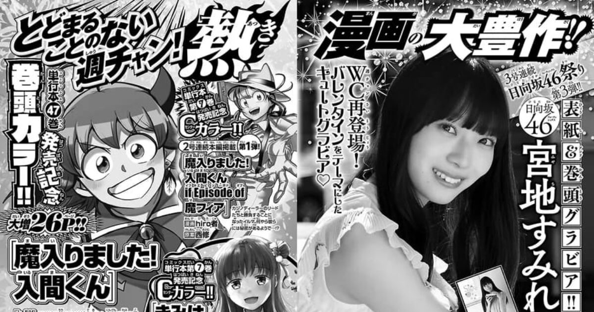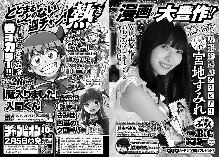 【2/5発売】「週刊少年チャンピオン 2026年 10号」表紙:宮地すみれ(日向坂46) ポストする シェアする LINEで送る 更新日 : 2026年1月29日(木) 週刊少年チャンピオン 秋田書店 週刊(毎週木曜日) 公式サイト 公式SNS ▼バックナンバー検索 Amazon 楽天ブックス 楽天市場 週刊少年チャンピオン 2026年 2/19号 No.103号連続 日向坂46祭り 第3弾!!表紙&巻頭グラビア宮地すみれ(日向坂46)週チャン再登場!バレンタインをテーマにしたキュートグラビア♡特別付録両面BIGポスタープレゼント限定QUOカード 200名 セブンネットで見る楽天市場で見る 紙版を購入 販売期間や在庫状況により、リンク先のショップで購入できない場合があります。ご了承ください。