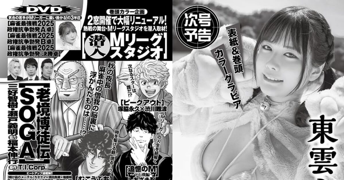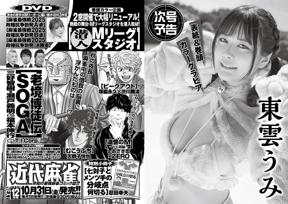 amazon.co.jp 【10/31発売】「近代麻雀 2025年 12月号」表紙:東雲うみ ポストする シェアする LINEで送る 更新日 : 2025年10月21日(火) 近代麻雀 竹書房 月刊(毎月1日) 公式サイト ▼バックナンバー Amazonで検索 楽天ブックスで検索 近代麻雀 2025年 12月号表紙&巻頭グラビア東雲うみW付録DVD気合の若手がMリーガーに襲い掛かる!の3半荘[麻雀最強戦2025政権抗争勃発A卓][麻雀最強戦2025政権抗争勃発B卓][麻雀最強戦2025政権抗争勃発決勝卓]特別小冊子[七対子とメンツ手の分岐点何切る]忍田幸夫 Amazonで見る 紙版を購入 販売期間や在庫状況により、リンク先のショップで購入できない場合があります。ご了承ください。