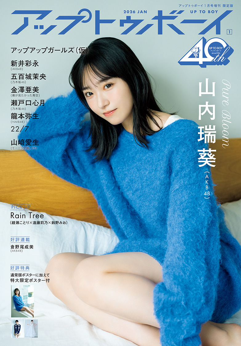 amazon.co.jp 【11/21発売】「アップトゥボーイ 2026年 1月号」表紙:瀬戸口心月(乃木坂46) ポストする シェアする LINEで送る 更新日 : 2025年11月21日(金) アップトゥボーイ ワニブックス 月刊(毎月22日) 公式サイト 公式SNS ▼バックナンバー Amazonで検索 楽天ブックスで検索 楽天市場で検索 アップトゥボーイ vol.357 2026年 1月号セブンネット限定版TSUTAYA限定版【通常版】表紙瀬戸口心月(乃木坂46)【通常版】裏表紙五百城茉央(乃木坂46)【セブンネット限定版】表紙・裏表紙22/7【TSUTAYA限定版】表紙・裏表紙山内瑞葵(AKB48)グラビア瀬戸口心月(乃木坂46)五百城茉央(乃木坂46)新井彩永(AKB48)金澤亜美(僕が見たかった青空)山﨑愛生(モーニング娘。’25)22/7アップアップガールズ(仮)龍本弥生(NMB48)山内瑞葵(AKB48)連載倉野尾成美(AKB48)PICK UP綾瀬ことり × 遠藤莉乃 × 鈴野みお(Rain Tree)付録瀬戸口心月 / 五百城茉央 特大両面ポスター セブンネットで見るAmazonで見る楽天ブックスで見る楽天市場で見る 紙版を購入 販売期間や在庫状況により、リンク先のショップで購入できない場合があります。ご了承ください。