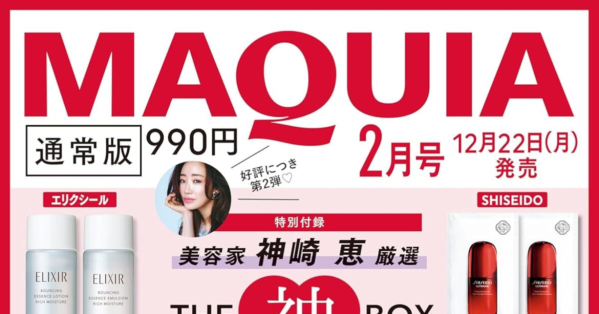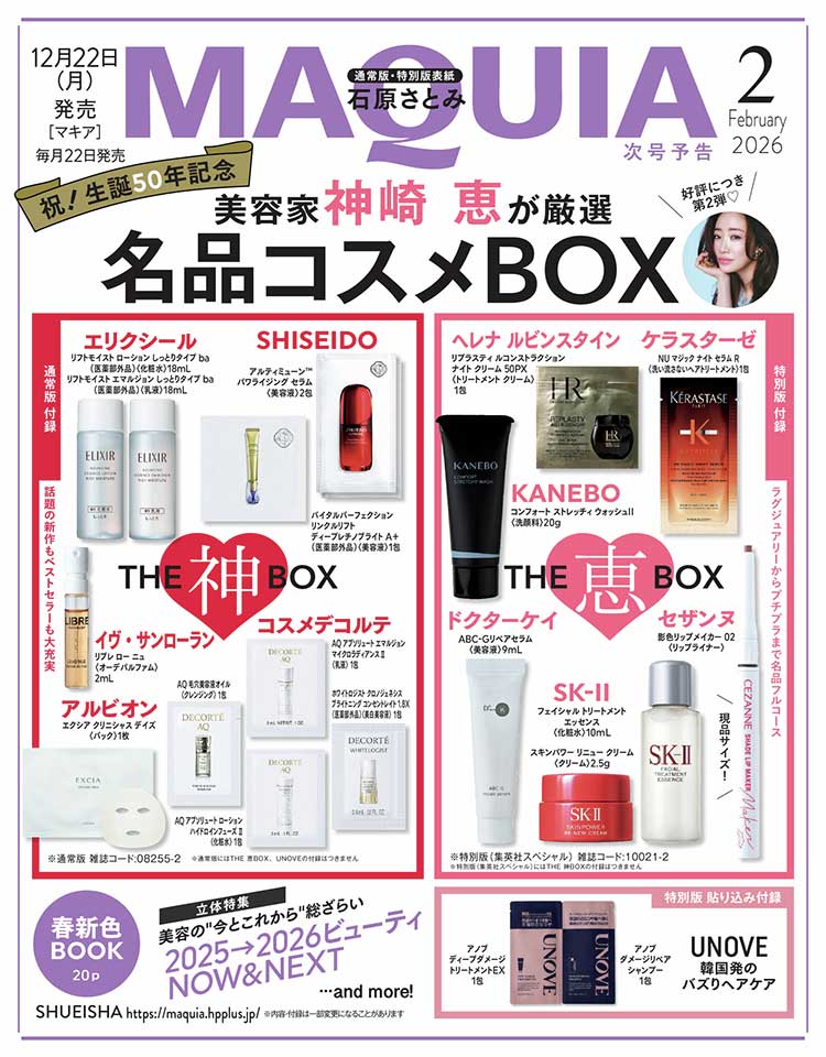 amazon.co.jp 【12/22発売】「MAQUIA 2026年 2月号」表紙:石原さとみ ポストする シェアする LINEで送る 更新日 : 2025年11月24日(月) MAQUIA 集英社 月刊(毎月23日) 公式サイト 公式SNS ▼バックナンバー Amazonで検索 楽天ブックスで検索 楽天市場で検索 MAQUIA(マキア) 2026年 2月号 通常版 / 特別版表紙石原さとみ立体特集美容の今とこれから総ざらい2025→2026ビューティNOW&NEXTマキアモデルズ[参考]鈴木えみ小嶋陽菜与田祐希 Amazonで見る楽天市場で見る 紙版を購入 販売期間や在庫状況により、リンク先のショップで購入できない場合があります。ご了承ください。