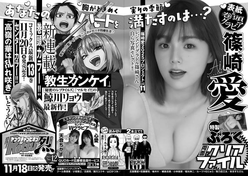 amazon.co.jp 【11/18発売】「ヤングチャンピオン烈 2025年 No.12」表紙:篠崎愛 / 天音ちか 心愛 ポストする シェアする LINEで送る 更新日 : 2025年10月25日(土) ヤングチャンピオン烈 秋田書店 月刊(毎月第3火曜日) 公式サイト 公式SNS ▼バックナンバー Amazonで検索 楽天ブックスで検索 楽天市場で検索 ヤングチャンピオン烈 2025年 12/30号 No.12表紙&巻頭グラビア篠崎愛「篠崎愛2025プロジェクト」vol.11センターWグラビア[ミスヤングチャンピオン2025グランプリ]天音ちか心愛付録篠崎愛 両面クリアファイル応募者全員サービス天音ちか・心愛 QUOカード 各1種プレゼント天音ちか・心愛 サイン付き生チェキ Amazonで見る楽天ブックスで見る 紙版を購入 販売期間や在庫状況により、リンク先のショップで購入できない場合があります。ご了承ください。