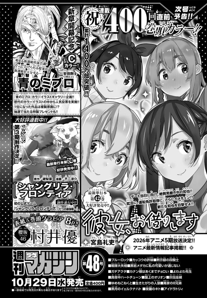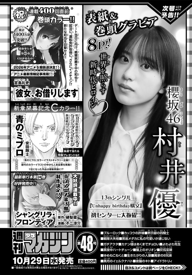 amazon.co.jp 【10/29発売】「週刊少年マガジン 2025年 48号」表紙:村井優(櫻坂46) ポストする シェアする LINEで送る 更新日 : 2025年10月22日(水) 週刊少年マガジン 講談社 週刊(毎週水曜日) 公式サイト 公式SNS ▼バックナンバー Amazonで検索 楽天ブックスで検索 楽天市場で検索 週刊少年マガジン 2025年 11/12号 No.48表紙&巻頭グラビア村井優(櫻坂46)世界を照らす新時代ヒロイン13thシングル「Unhappy birthday構文」新センターに大抜擢!! Amazonで見る楽天市場で見る 紙版を購入 販売期間や在庫状況により、リンク先のショップで購入できない場合があります。ご了承ください。