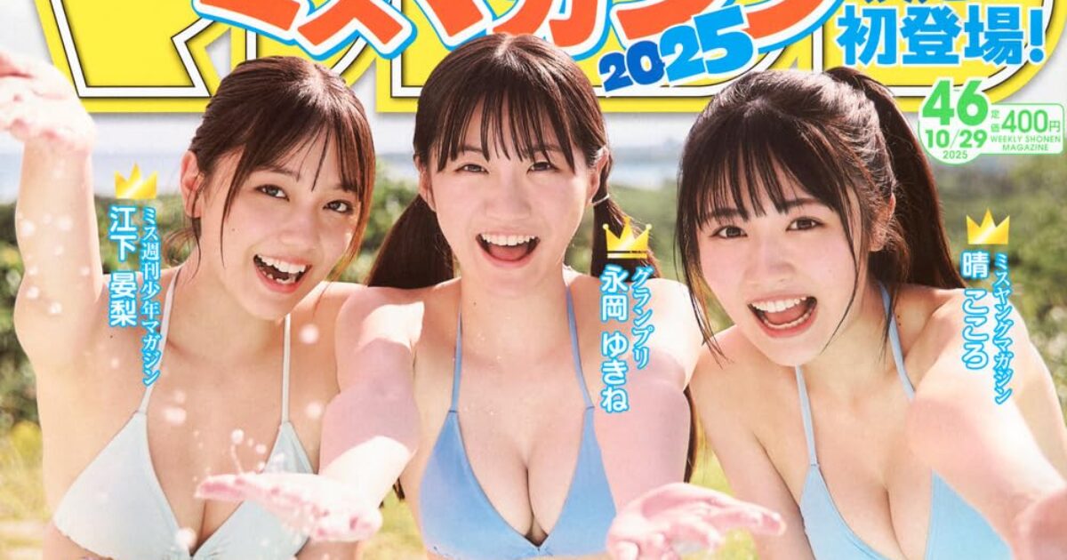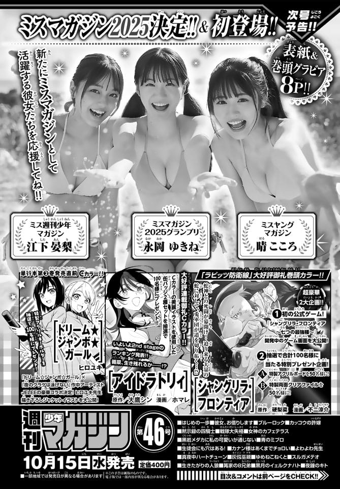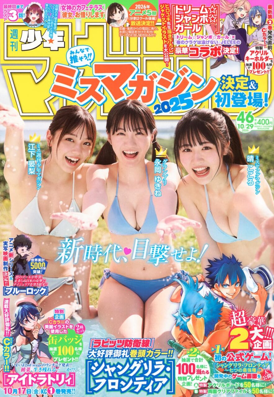amazon.co.jp 【10/15発売】「週刊少年マガジン 2025年 46号」表紙:江下晏梨×永岡ゆきね×晴こころ ポストする シェアする LINEで送る 更新日 : 2025年10月9日(木) 週刊少年マガジン 講談社 週刊(毎週水曜日) 公式サイト 公式SNS ▼バックナンバー Amazonで検索 楽天ブックスで検索 楽天市場で検索 週刊少年マガジン 2025年 10/29号 No.46表紙&巻頭グラビアミスマガジン2025決定&初登場!!江下晏梨[ミス週刊少年マガジン]永岡ゆきね[ミスマガジン2025グランプリ]晴こころ[ミスヤングマガジン] Amazonで見る楽天市場で見る 紙版を購入 販売期間や在庫状況により、リンク先のショップで購入できない場合があります。ご了承ください。