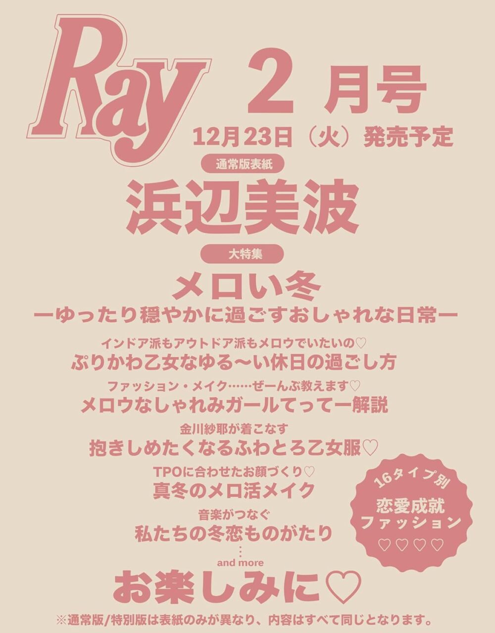 amazon.co.jp 【12/23発売】「Ray 2026年 2月号」表紙:浜辺美波 ポストする シェアする LINEで送る 更新日 : 2025年11月24日(月) Ray 主婦の友社 月刊(毎月23日) 公式サイト 公式SNS ▼バックナンバー Amazonで検索 楽天ブックスで検索 楽天市場で検索 Ray(レイ) 2026年 2月号 通常版 / 特別版【通常版】表紙浜辺美波【特別版】表紙・ピンナップ–特集メロい冬一ゆったり穏やかに過ごすおしゃれな日常一Ray 専属モデル[参考]加藤ナナ中村里帆金川紗耶(乃木坂46)村瀬紗英三浦理奈本田紗来中川紅葉北里琉櫻井優衣(FRUITS ZIPPER) Amazonで見る楽天市場で見る 紙版を購入 販売期間や在庫状況により、リンク先のショップで購入できない場合があります。ご了承ください。