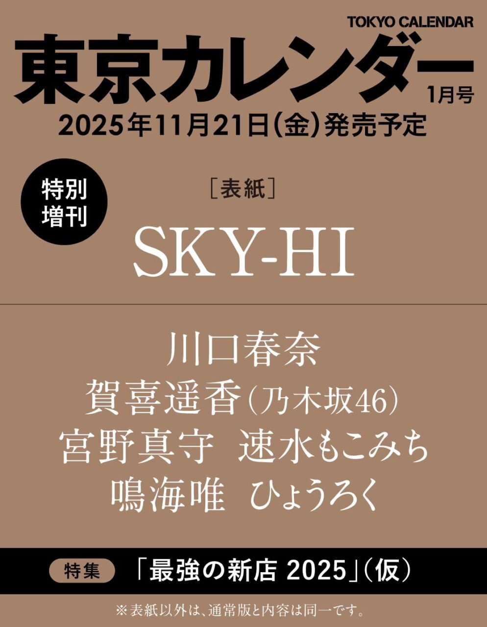 amazon.co.jp 【11/21発売】「東京カレンダー 2026年 1月号」表紙:川口春奈 / 賀喜遥香(乃木坂46) 鳴海唯 ポストする シェアする LINEで送る 更新日 : 2025年10月26日(日) 東京カレンダー 東京カレンダー 月刊(毎月21日) 公式サイト 公式SNS ▼バックナンバー Amazonで検索 楽天ブックスで検索 楽天市場で検索 東京カレンダー 2026年 1月号 通常版 / 特別増刊【通常版】表紙川口春奈【特別増刊】表紙SKY-HI特集最強の新店 2025(仮)掲載賀喜遥香(乃木坂46)宮野真守速水もこみち鳴海唯ひょうろく Amazonで見る 紙版を購入 販売期間や在庫状況により、リンク先のショップで購入できない場合があります。ご了承ください。