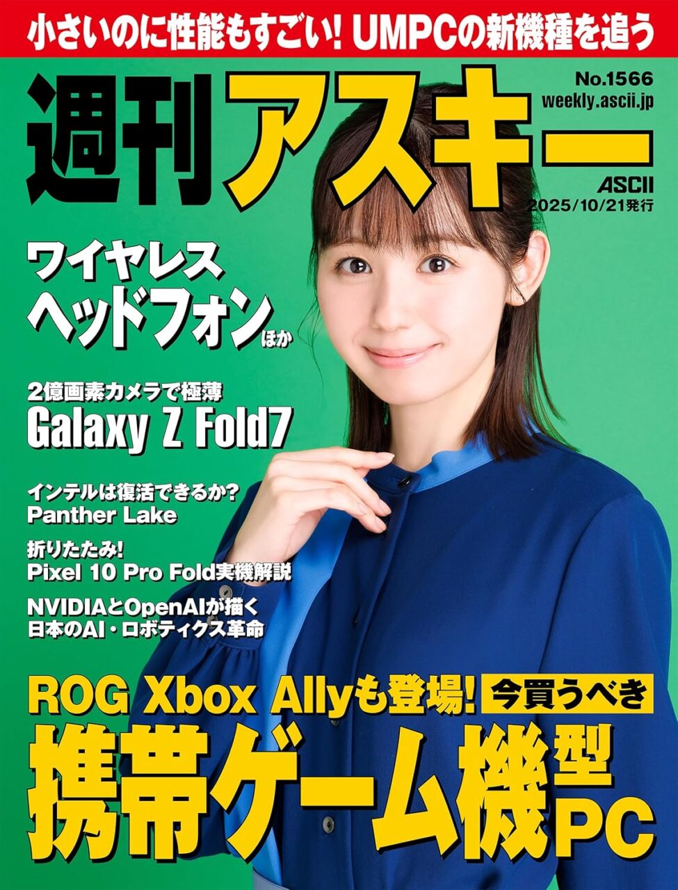 【10/21発売】「週刊アスキー No.1566」表紙:小池里奈 ポストする シェアする LINEで送る 更新日 : 2025年10月21日(火) 週刊アスキー 角川アスキー総合研究所 週刊(毎週月曜日) 公式サイト 公式SNS ▼バックナンバー Amazonで検索 楽天ブックスで検索 週刊アスキーNo.1566表紙小池里奈特集Xboxも登場、UMPCの最新事情ちょっとこだわれるオーディオ Kindle版(電子書籍)楽天Kobo版(電子書籍) 電子書籍版を購入 販売期間や在庫状況により、リンク先のショップで購入できない場合があります。ご了承ください。