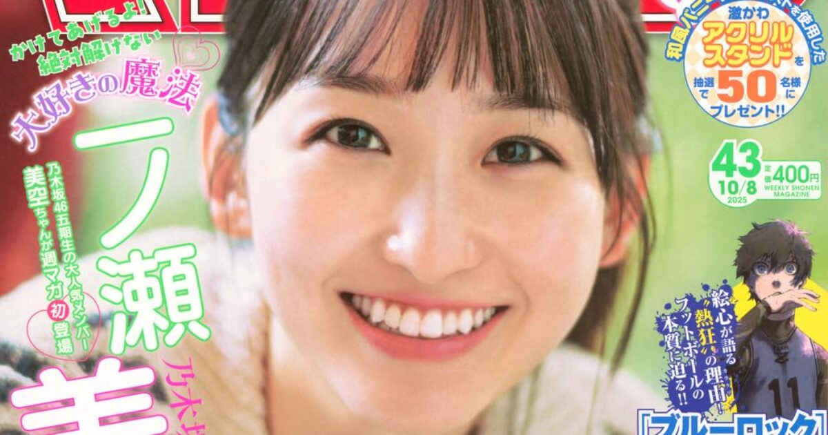 amazon.co.jp 【9/24発売】「週刊少年マガジン 2025年 43号」表紙:一ノ瀬美空(乃木坂46) ポストする シェアする LINEで送る 更新日 : 2025年9月24日(水) 週刊少年マガジン 講談社 週刊(毎週水曜日) 公式サイト 公式SNS ▼バックナンバー Amazonで検索 楽天ブックスで検索 楽天市場で検索 週刊少年マガジン 2025年 10/8号 No.43表紙&巻頭グラビア一ノ瀬美空(乃木坂46)巻頭カラー8ページ!! 乃木坂46五期生の大人気メンバー美空ちゃんが週マガ初登場♥ かけてあげるよ! 絶対解けない大好きの魔法! 優しさあふれる笑顔は、みんなを元気にする証。インタビュー花澤香菜 Amazonで見るKindle版(電子書籍)楽天Kobo版(電子書籍)楽天市場で見る 紙版を購入 電子書籍版を購入 販売期間や在庫状況により、リンク先のショップで購入できない場合があります。ご了承ください。