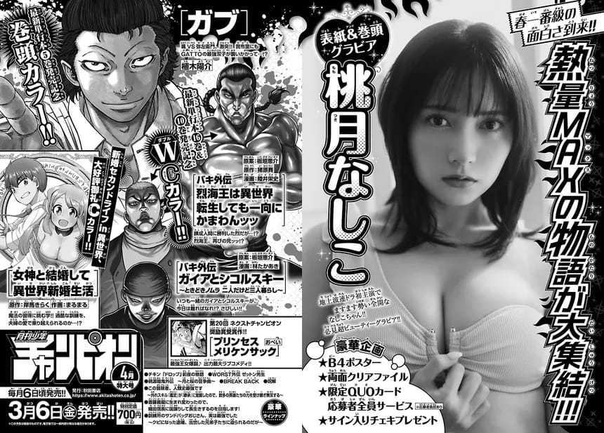 amazon.co.jp 【3/6発売】「月刊少年チャンピオン 2026年 4月号」表紙:桃月なしこ ポストする シェアする LINEで送る 更新日 : 2026年2月6日(金) 月刊少年チャンピオン 秋田書店 月刊(毎月6日) 公式サイト 公式SNS ▼バックナンバー検索 Amazon 楽天ブックス 楽天市場 月刊少年チャンピオン 2026年 4月号表紙&巻頭グラビア桃月なしこ地上波連ドラ初出演でますます勢い全開ななしこちゃん!!必見超ビューティーグラビア!!特別付録B4ポスター両面クリアファイル応募者全員サービス限定QUOカードプレゼントサイン入りチェキ Amazonで見る 紙版を購入 販売期間や在庫状況により、リンク先のショップで購入できない場合があります。ご了承ください。