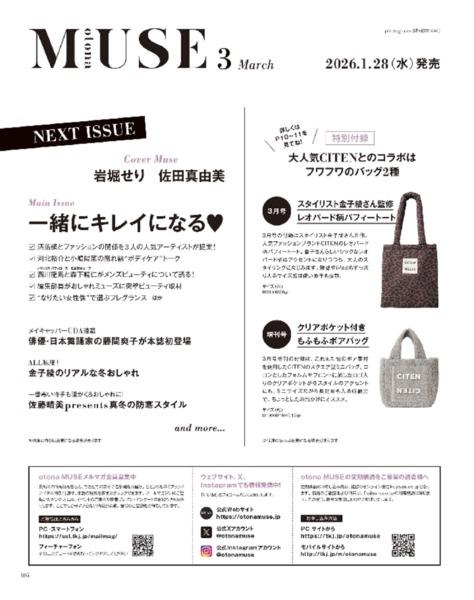 amazon.co.jp 【1/28発売】「otona MUSE 2026年 3月号」表紙:岩堀せり × 佐田真由美 ポストする シェアする LINEで送る 更新日 : 2026年1月10日(土) otona MUSE 宝島社 月刊(毎月28日) 公式サイト 公式SNS ▼バックナンバー Amazonで検索 楽天ブックスで検索 楽天市場で検索 otona MUSE(オトナミューズ) 2026年 3月号 通常版増刊 ※セブンネット表紙岩堀せり × 佐田真由美特集一緒にキレイになる♡掲載小嶋陽菜【通常版】特別付録CITEN[シテン]スタイリスト金子綾さん監修レオパード柄パフィートート【増刊】特別付録CITEN [シテン]クリアポケット付きもふもふボアバッグ Amazonで見る 紙版を購入 販売期間や在庫状況により、リンク先のショップで購入できない場合があります。ご了承ください。