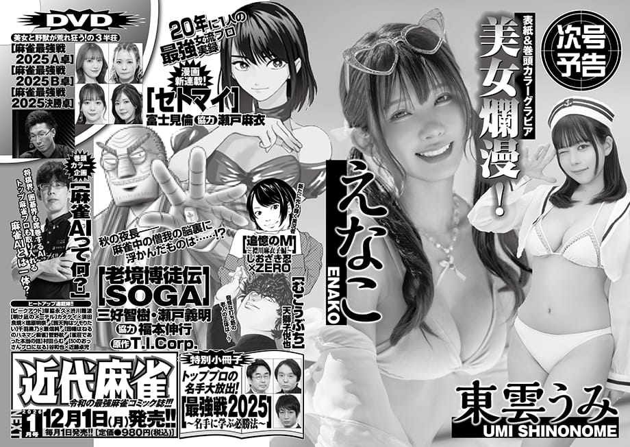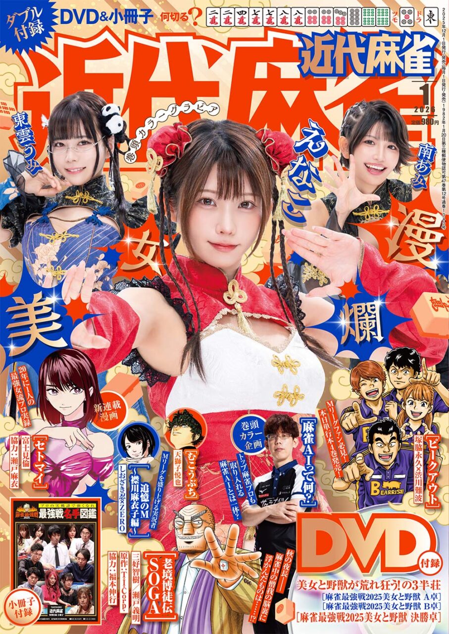 amazon.co.jp 【12/1発売】「近代麻雀 2026年 1月号」表紙:えなこ × 東雲うみ × 南あみ ポストする シェアする LINEで送る 更新日 : 2025年12月1日(月) 近代麻雀 竹書房 月刊(毎月1日) 公式サイト ▼バックナンバー Amazonで検索 楽天ブックスで検索 近代麻雀 2026年 1月号表紙&巻頭グラビアえなこ × 東雲うみ × 南あみ付録DVD「美女と野獣が荒れ狂う!の3半荘」特別小冊子「最強戦名手図鑑」 Amazonで見る楽天ブックスで見る楽天市場で見る 紙版を購入 販売期間や在庫状況により、リンク先のショップで購入できない場合があります。ご了承ください。