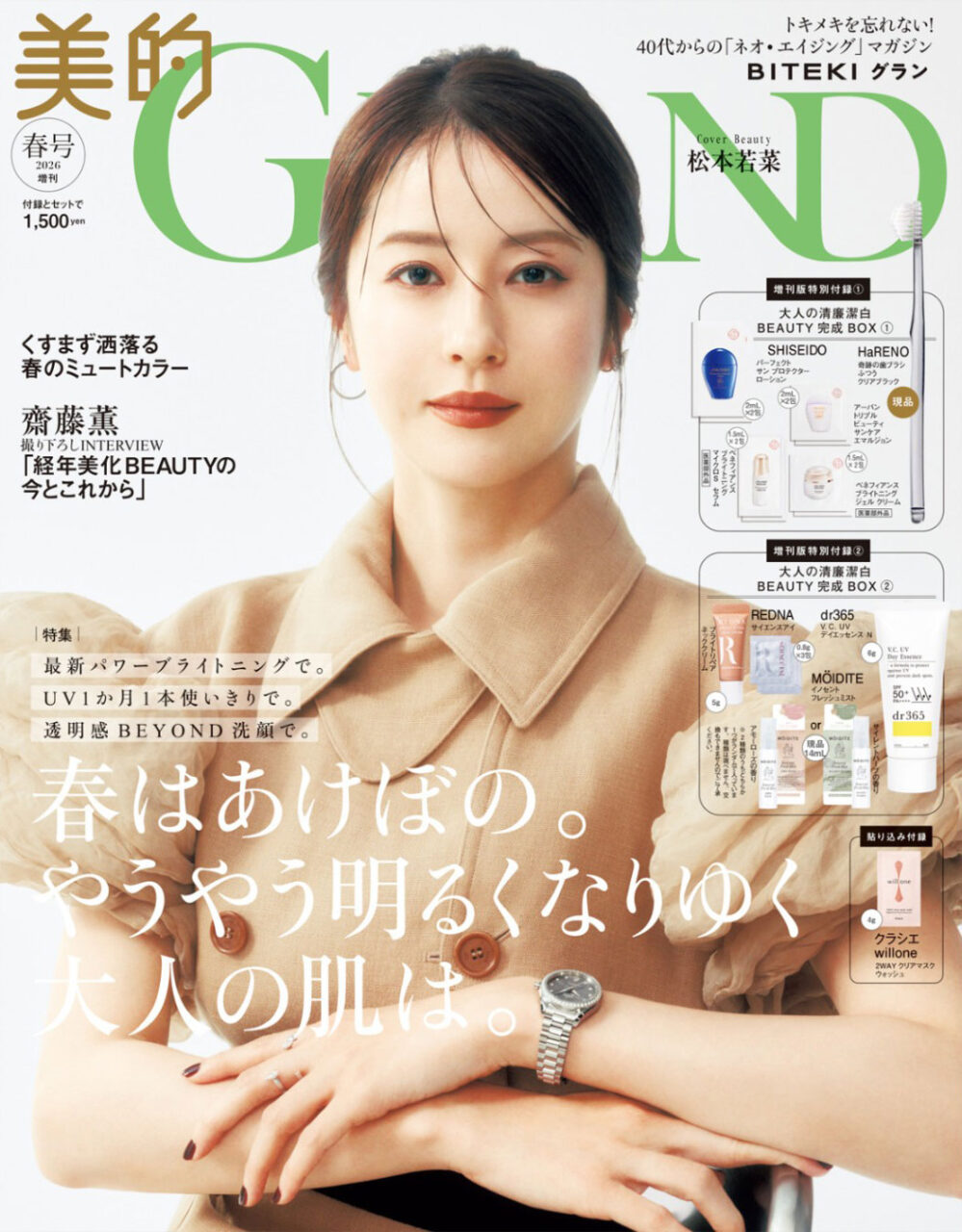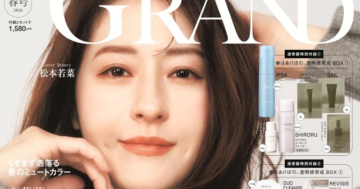 amazon.co.jp 【3/12発売】「美的GRAND 2026年 春号」表紙:松本若菜 ポストする シェアする LINEで送る 更新日 : 2026年3月12日(木) 美的GRAND 小学館 季刊(3.6.9.12月12日) 公式サイト 公式SNS ▼バックナンバー検索 Amazon 楽天ブックス 楽天市場 美的GRAND(ビテキグラン) 2026年 春号 通常版 / 増刊表紙松本若菜【通常版】特別付録春はあけぼの。透明感育成BOX ①②【増刊】特別付録大人の清廉潔白BEAUTY完成BOX ①② Amazonで見る楽天ブックスで見る楽天市場で見る 紙版を購入 販売期間や在庫状況により、リンク先のショップで購入できない場合があります。ご了承ください。