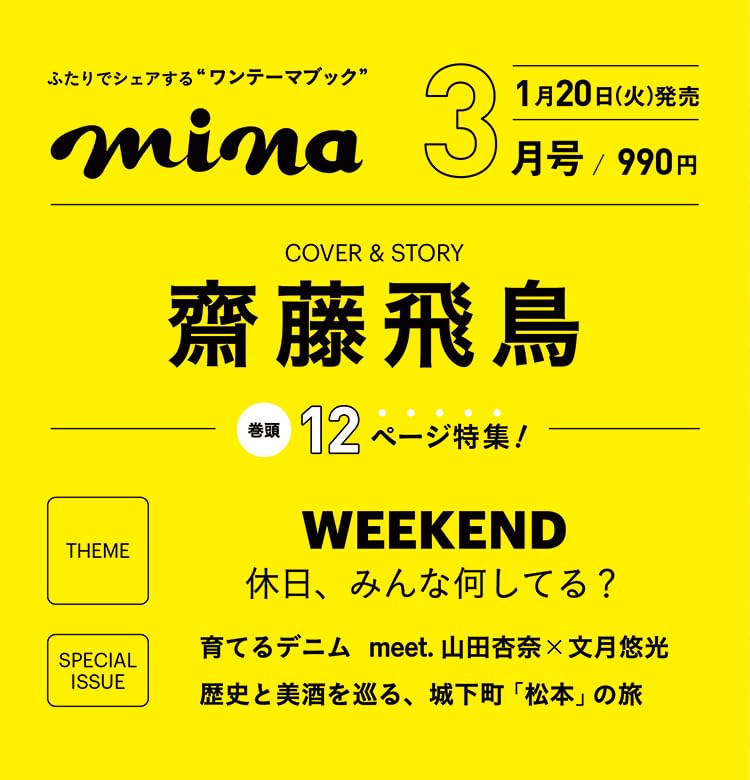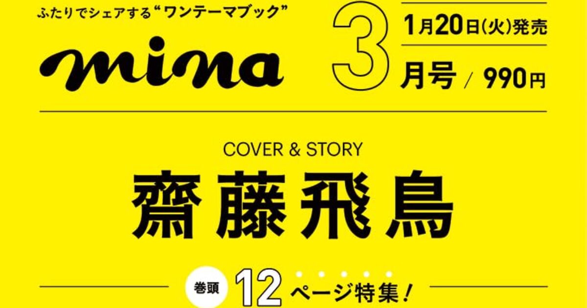 amazon.co.jp 【1/20発売】「mina 2026年 2・3月 合併号」表紙:齋藤飛鳥 ポストする シェアする LINEで送る 更新日 : 2026年1月6日(火) mina 主婦の友社 月刊(毎月20日) 公式サイト 公式SNS ▼バックナンバー Amazonで検索 楽天ブックスで検索 楽天市場で検索 mina(ミーナ) 2026年 2・3月 合併号表紙齋藤飛鳥特集WEEKEND休日、みんな何してる?掲載育てるデニム meet. 山田杏奈 × 文月悠光歴史と美酒を巡る、城下町「松本」の旅 Amazonで見る楽天市場で見る 紙版を購入 販売期間や在庫状況により、リンク先のショップで購入できない場合があります。ご了承ください。