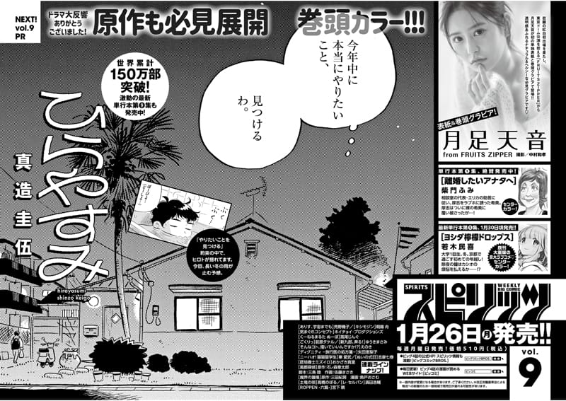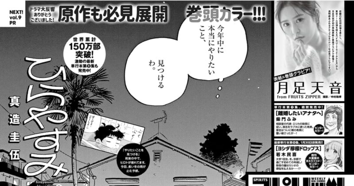 amazon.co.jp 【1/26発売】「週刊ビッグコミックスピリッツ 2026年 No.9」表紙:月足天音(FRUITS ZIPPER) ポストする シェアする LINEで送る 更新日 : 2026年1月19日(月) 週刊ビッグコミックスピリッツ 小学館 週刊(毎週月曜日) 公式サイト 公式SNS ▼バックナンバー検索 Amazon 楽天ブックス 楽天市場 週刊ビッグコミックスピリッツ 2026年 2/9号 No.9表紙&巻頭グラビア月足天音(FRUITS ZIPPER) Amazonで見る楽天市場で見る 紙版を購入 販売期間や在庫状況により、リンク先のショップで購入できない場合があります。ご了承ください。