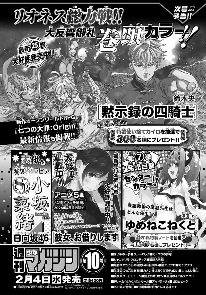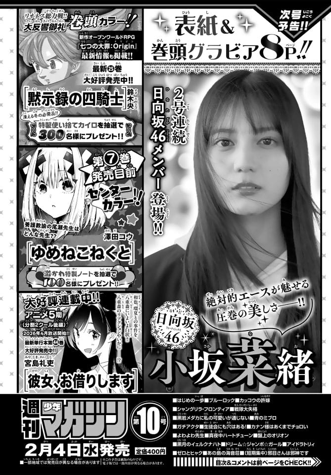 amazon.co.jp 【2/4発売】「週刊少年マガジン 2026年 10号」表紙:小坂菜緒(日向坂46) ポストする シェアする LINEで送る 更新日 : 2026年1月28日(水) 週刊少年マガジン 講談社 週刊(毎週水曜日) 公式サイト 公式SNS ▼バックナンバー検索 Amazon 楽天ブックス 楽天市場 週刊少年マガジン 2026年 2/18号 No.10表紙&巻頭グラビア小坂菜緒(日向坂46)2号連続日向坂46メンバー登場!!絶対的エースが魅せる圧巻の美しさ──!! Amazonで見る楽天市場で見る 紙版を購入 販売期間や在庫状況により、リンク先のショップで購入できない場合があります。ご了承ください。