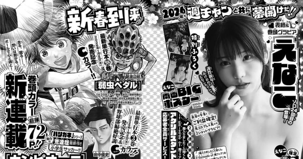 【12/25発売】「週刊少年チャンピオン 2026年 4・5 合併号」表紙:えなこ ポストする シェアする LINEで送る 更新日 : 2025年12月11日(木) 週刊少年チャンピオン 秋田書店 週刊(毎週木曜日) 公式サイト 公式SNS ▼バックナンバー Amazonで検索 楽天ブックスで検索 楽天市場で検索 週刊少年チャンピオン 2026年 1/15号 No.4・5 合併号表紙&巻頭グラビアえなこ謹賀新年!あけおめはえなこちゃんから!特別付録両面BIGポスター応募者全員サービス限定QUOカード セブンネットで見る 紙版を購入 販売期間や在庫状況により、リンク先のショップで購入できない場合があります。ご了承ください。