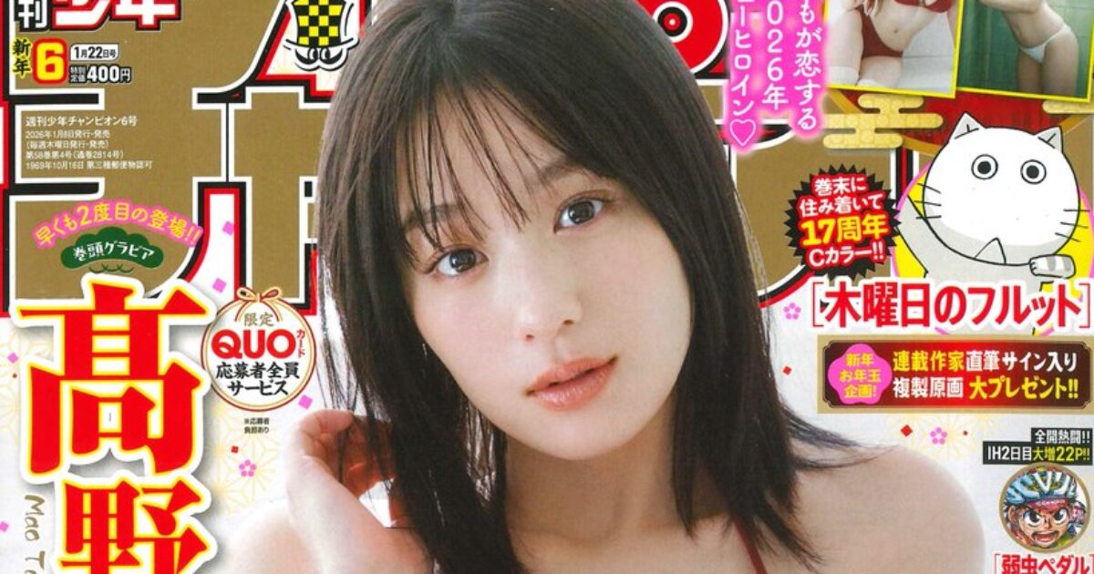【1/8発売】「週刊少年チャンピオン 2026年 6号」表紙:髙野真央 ポストする シェアする LINEで送る 更新日 : 2026年1月8日(木) 週刊少年チャンピオン 秋田書店 週刊(毎週木曜日) 公式サイト 公式SNS ▼バックナンバー検索 Amazon 楽天ブックス 楽天市場 週刊少年チャンピオン 2026年 1/22号 No.6表紙&巻頭グラビア髙野真央早くも2度目の週チャン降臨!!誰もが恋する2026年のニューヒロイン特別付録両面BIGポスター応募者全員サービス限定QUOカードプレゼント連載作家サイン入り 複製原画 セブンネットで見るKindle版(電子書籍)楽天Kobo版(電子書籍) 紙版を購入 電子書籍版を購入 販売期間や在庫状況により、リンク先のショップで購入できない場合があります。ご了承ください。