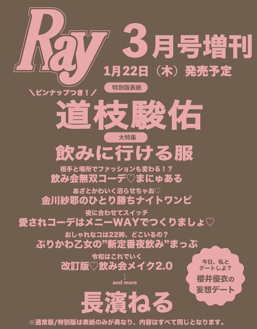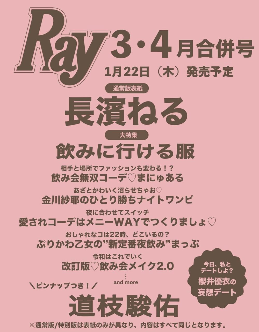 amazon.co.jp 【1/22発売】「Ray 2026年 3・4月号」表紙:長濱ねる ポストする シェアする LINEで送る 更新日 : 2025年12月17日(水) Ray 主婦の友社 月刊(毎月23日) 公式サイト 公式SNS ▼バックナンバー Amazonで検索 楽天ブックスで検索 楽天市場で検索 Ray(レイ) 2026年 3・4月号 通常版 / 増刊 特別版【通常版】表紙長濱ねる【特別版】表紙・ピンナップ道枝駿佑(なにわ男子)大特集飲みに行ける服Ray 専属モデル[参考]加藤ナナ中村里帆金川紗耶(乃木坂46)村瀬紗英三浦理奈本田紗来中川紅葉北里琉櫻井優衣(FRUITS ZIPPER) Amazonで見る楽天市場で見る 紙版を購入 販売期間や在庫状況により、リンク先のショップで購入できない場合があります。ご了承ください。
