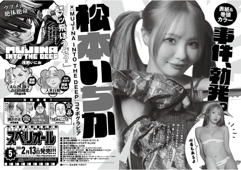 amazon.co.jp 【2/13発売】「ビッグコミックスペリオール 2026年 5号」表紙:松本いちか ポストする シェアする LINEで送る 更新日 : 2026年2月2日(月) ビッグコミックスペリオール 小学館 月2回刊(毎月第2・第4金曜日) 公式サイト 公式SNS ▼バックナンバー検索 Amazon 楽天ブックス 楽天市場 ビッグコミックスペリオール 2025年 2/27号 5号表紙&巻頭グラビア松本いちか『MUJINA INTO THE DEEP』コラボグラビアセクシー業界の超人気女優が初登場!唯一無二のアナーキー&妖艶感… これはもう事件です!!『MUJINA INTO THE DEEP』ムジナを演じる姿も必見! Amazonで見る楽天市場で見る 紙版を購入 販売期間や在庫状況により、リンク先のショップで購入できない場合があります。ご了承ください。