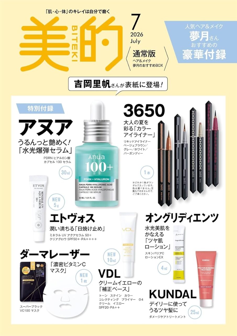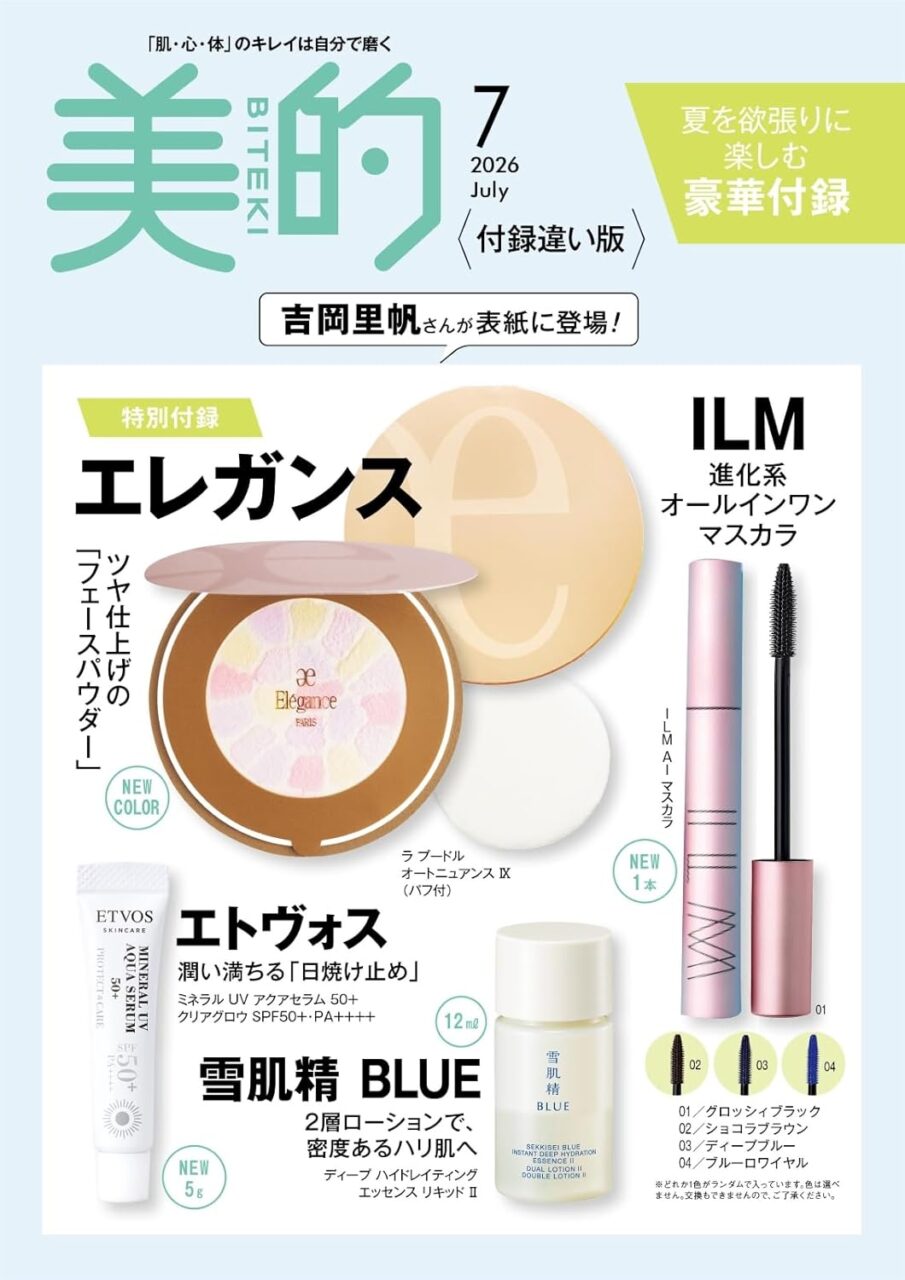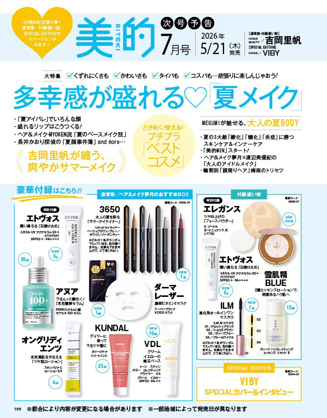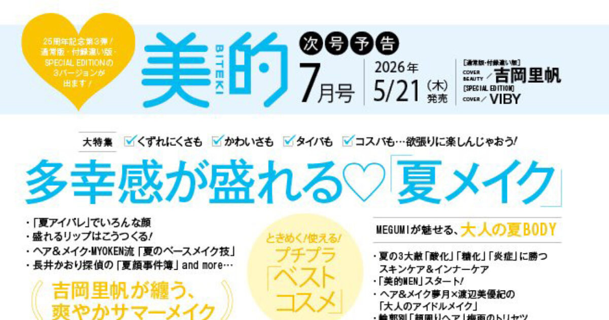 amazon.co.jp 【5/21発売】「美的 2026年 7月号」表紙:吉岡里帆 ポストする シェアする LINEで送る 更新日 : 2026年4月27日(月) 美的 小学館 月刊(毎月23日) 公式サイト 公式SNS ▼バックナンバー検索 Amazon 楽天ブックス 楽天市場 美的 2026年 7月号 通常版 / スペシャル / 増刊【通常版】【スペシャル】表紙吉岡里帆【増刊】表紙VIBY大特集“多幸感”が盛れる♡「夏メイク」 Amazonで見る楽天ブックスで見る楽天市場で見る 紙版を購入 販売期間や在庫状況により、リンク先のショップで購入できない場合があります。ご了承ください。
