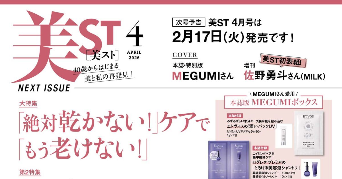 amazon.co.jp 【2/17発売】「美ST 2026年 4月号」表紙:MEGUMI ポストする シェアする LINEで送る 更新日 : 2026年2月3日(火) 美ST 光文社 月刊(毎月17日) 公式サイト 公式SNS ▼バックナンバー検索 Amazon 楽天ブックス 楽天市場 美ST(ビスト) 2026年 4月号 本誌 / 特別版 / 増刊 Special Edition 【本誌・特別版】表紙 MEGUMI 【増刊】表紙 佐野勇斗(M!LK) 大特集 「絶対乾かない!」ケアで「もう老けない!」 Amazonで見る楽天ブックスで見る楽天市場で見る 紙版を購入 販売期間や在庫状況により、リンク先のショップで購入できない場合があります。ご了承ください。