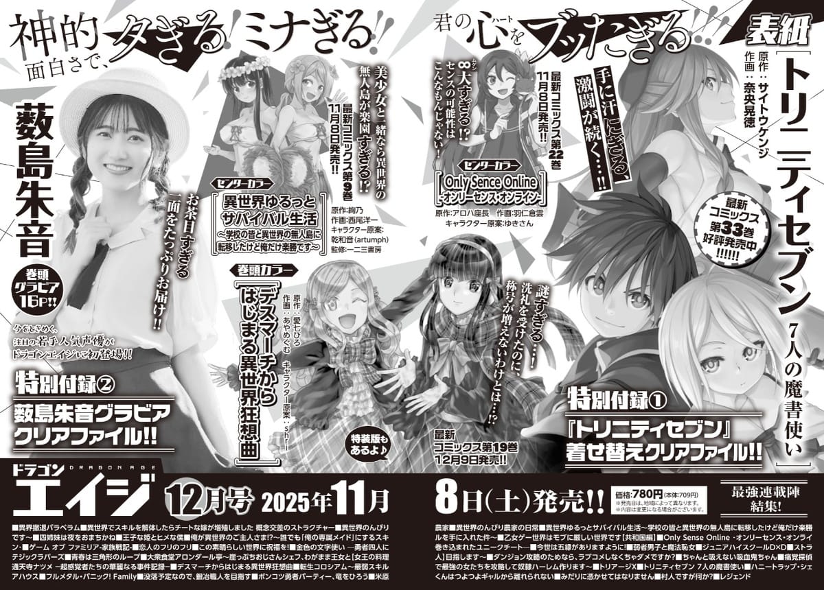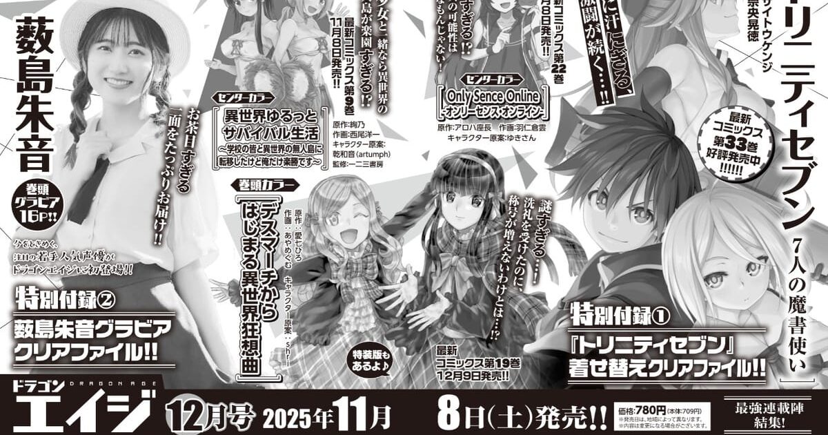 amazon.co.jp 【11/8発売】「月刊ドラゴンエイジ 2025年 12月号」巻頭:薮島朱音 ポストする シェアする LINEで送る 更新日 : 2025年10月25日(土) ドラゴンエイジ KADOKAWA 月刊(毎月9日) 公式サイト 公式SNS ▼バックナンバー Amazonで検索 楽天ブックスで検索 楽天市場で検索 月刊ドラゴンエイジ 2025年 12月号表紙『トリニティセブン 7人の魔書使い』巻頭グラビア薮島朱音今をときめく、注目の若手人気声優がドラゴンエイジに初登場!!お茶目すぎる一面をたっぷりお届け!!W付録『トリニティセブン』着せ替えクリアファイル薮島朱音 グラビアクリアファイル Amazonで見る楽天市場で見る 紙版を購入 販売期間や在庫状況により、リンク先のショップで購入できない場合があります。ご了承ください。