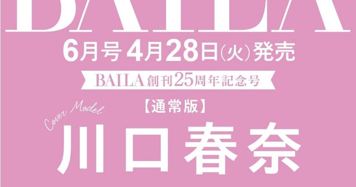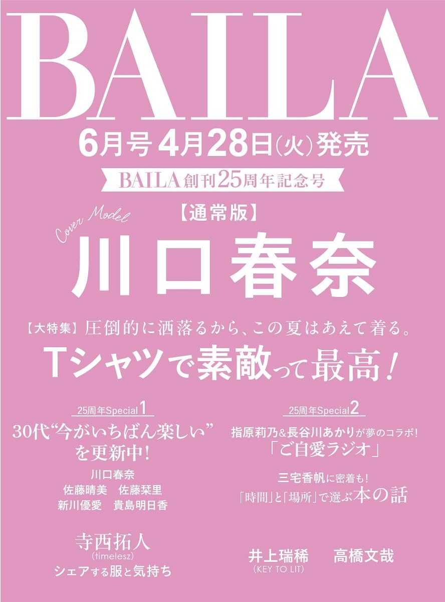 amazon.co.jp 【4/28発売】「BAILA 2026年 6月号」表紙:川口春奈 ポストする シェアする LINEで送る 更新日 : 2026年3月27日(金) BAILA 集英社 月刊(毎月28日) 公式サイト 公式SNS ▼バックナンバー検索 Amazon 楽天ブックス 楽天市場 BAILA(バイラ) 2026年 6月号 通常版 / 増刊 特別版【通常版】表紙川口春奈【特別版】表紙寺西拓人(timelesz)大特集圧倒的に酒落るから、この夏はあえて着る。Tシャツで素敵って最高!掲載佐藤晴美佐藤栞里新川優愛貴島明日香指原莉乃井上瑞稀(KEY TO LIT)高橋文哉 Amazonで見る楽天ブックスで見る楽天市場で見る 紙版を購入 販売期間や在庫状況により、リンク先のショップで購入できない場合があります。ご了承ください。