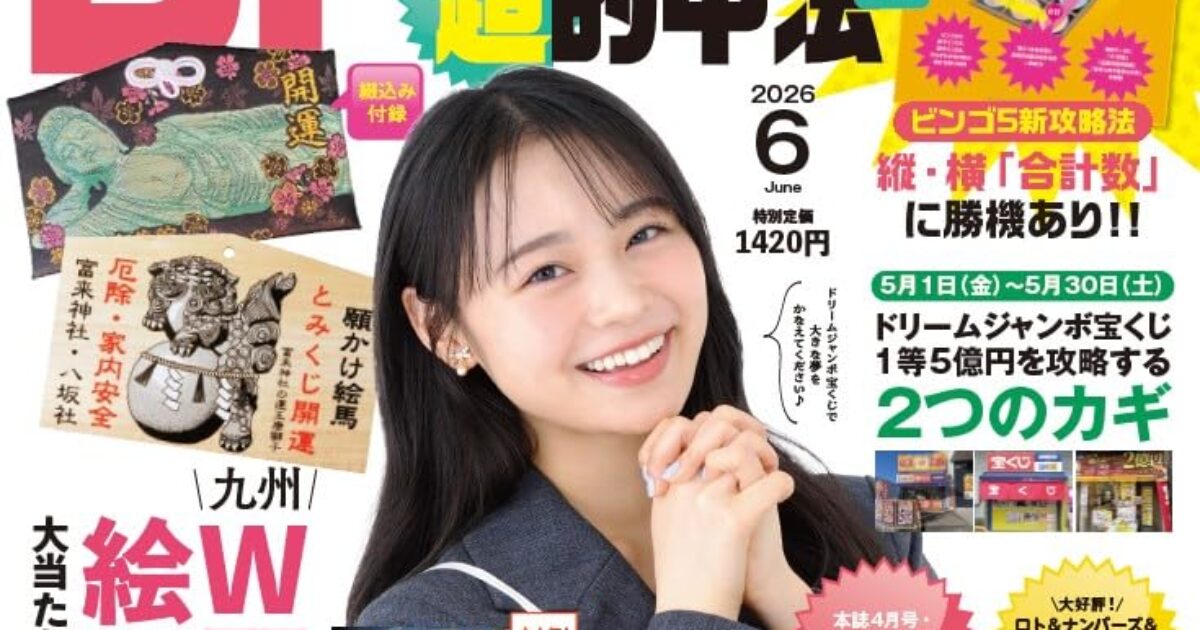 amazon.co.jp 【4/28発売】「ロト・ナンバーズ「超」的中法 2026年 6月号」表紙:林芽亜里 ポストする シェアする LINEで送る 更新日 : 2026年4月20日(月) ロト・ナンバーズ「超」的中法 主婦の友社 月刊(毎月29日) 公式サイト 公式SNS ▼バックナンバー検索 Amazon 楽天ブックス 楽天市場 ロト・ナンバーズ「超」的中法 2026年 6月号表紙林芽亜里別冊付録ビンゴ5新攻略法 縦・横「合計数」に勝機あり!!綴込み付録九州W願かけ絵馬に大当たりの願いを託そう!!特集夢の高額当せん者インタビューナンバーズ4一撃869万円当せんカギしっぽの猫が大当たりをひっかけてきた! Amazonで見る楽天ブックスで見る楽天市場で見る 紙版を購入 販売期間や在庫状況により、リンク先のショップで購入できない場合があります。ご了承ください。