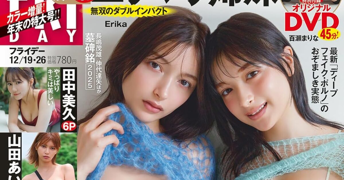 amazon.co.jp 【12/5発売】「FRIDAY 2025年 12/19・26 合併号」表紙:Erika × 百瀬まりな(エリマリ姉妹) / 田中美久 山田あい etc. ポストする シェアする LINEで送る 更新日 : 2025年12月5日(金) FRIDAY 講談社 週刊(毎週金曜日) 公式サイト 公式SNS ▼バックナンバー Amazonで検索 楽天ブックスで検索 楽天市場で検索 FRIDAY(フライデー) 2025年 12/19・26 合併号表紙&巻頭グラビア&メイキングDVD45分Erika × 百瀬まりな(エリマリ姉妹)グラビア田中美久山田あい沢口愛華井上晴美林祐衣早川渚紗相良茉優連載乃木坂46 乃木撮日向坂46 日向撮櫻坂46 櫻撮 Amazonで見るKindle版(電子書籍)楽天ブックスで見る楽天Kobo版(電子書籍)楽天市場で見る 【11/20発売】「FRIDAY GOLD グラビアムック 2025 Winter」表紙:Erika × 百瀬まりな(エリマリ姉妹) 紙版を購入 電子書籍版を購入 販売期間や在庫状況により、リンク先のショップで購入できない場合があります。ご了承ください。