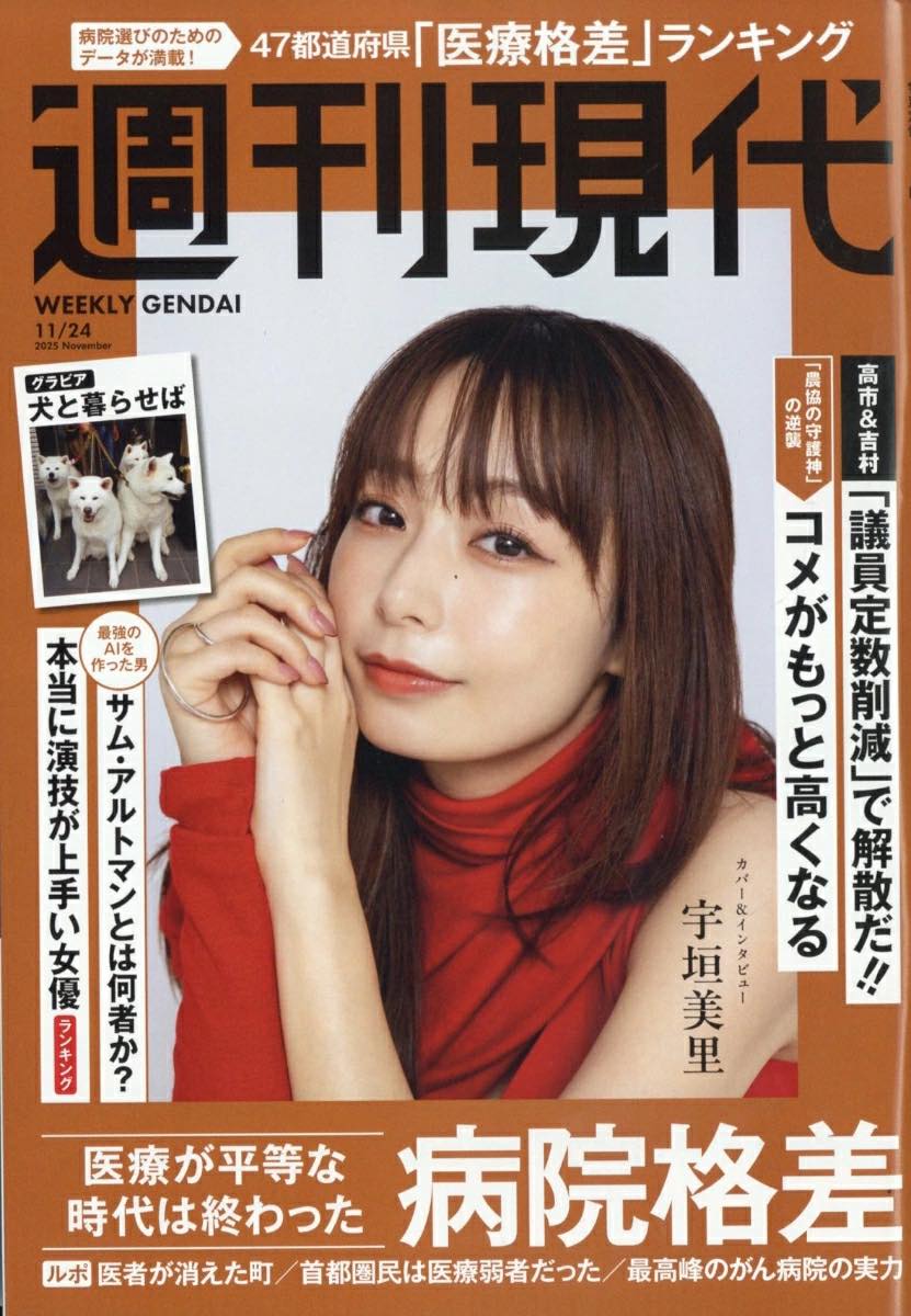 amazon.co.jp 【11/10発売】「週刊現代 2025年 11/24号」表紙:宇垣美里 ポストする シェアする LINEで送る 更新日 : 2025年11月9日(日) 週刊現代 講談社 隔週刊(隔週月曜日) 公式サイト 公式SNS ▼バックナンバー Amazonで検索 楽天ブックスで検索 楽天市場で検索 週刊現代 2025年 10/27号表紙&インタビュー宇垣美里総力特集病院格差医療が平等な時代は終わった Amazonで見る楽天ブックスで見る楽天市場で見る 紙版を購入 販売期間や在庫状況により、リンク先のショップで購入できない場合があります。ご了承ください。