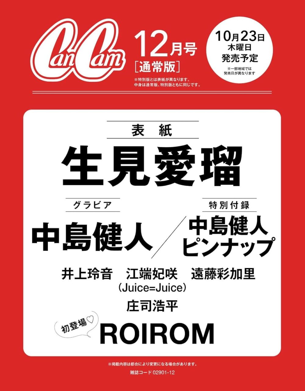 amazon.co.jp 【10/23発売】「CanCam 2025年 12月号」表紙:生見愛瑠 ポストする シェアする LINEで送る 更新日 : 2025年10月8日(水) CanCam 小学館 月刊(毎月23日) 公式サイト 公式SNS ▼バックナンバー Amazonで検索 楽天ブックスで検索 楽天市場で検索 CanCam(キャンキャン) 2025年 12月号 通常版 / 特別版【通常版】表紙生見愛瑠【特別版】表紙&グラビア中島健人特別付録中島健人 ピンナップ掲載井上玲音・江端妃咲・遠藤彩加里(Juice=Juice)庄司浩平ROIROMCanCam 専属モデル[参考]楓山下美月加藤史帆小室安未生見愛瑠佐々木莉佳子新沼凛空白宮みずほ Amazonで見る楽天ブックスで見る楽天市場で見る 紙版を購入 販売期間や在庫状況により、リンク先のショップで購入できない場合があります。ご了承ください。