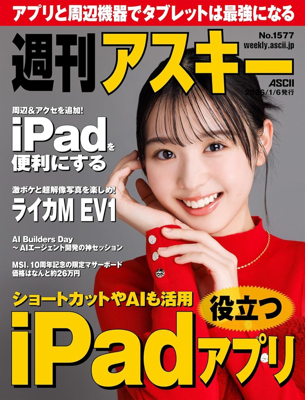【1/6発売】「週刊アスキー No.1577」表紙:宮迫翠月 ポストする シェアする LINEで送る 更新日 : 2026年1月6日(火) 週刊アスキー 角川アスキー総合研究所 週刊(毎週月曜日) 公式サイト 公式SNS ▼バックナンバー Amazonで検索 楽天ブックスで検索 週刊アスキー No.1577表紙宮迫翠月特集役立つiPadアプリ Kindle版(電子書籍)楽天Kobo版(電子書籍) 電子書籍版を購入 販売期間や在庫状況により、リンク先のショップで購入できない場合があります。ご了承ください。