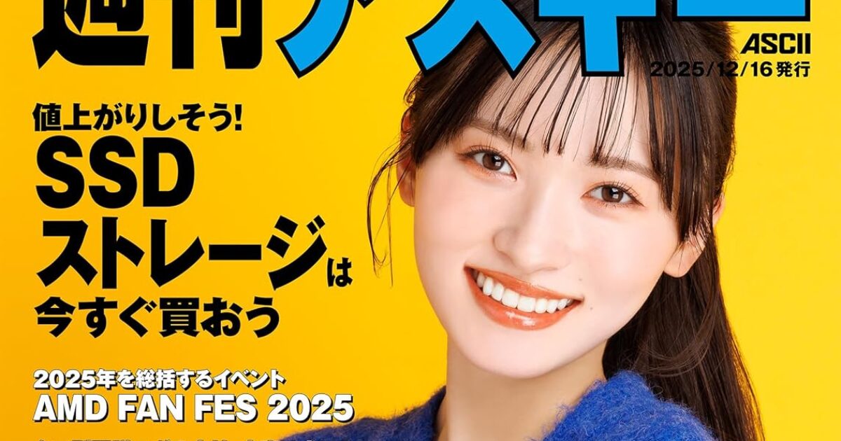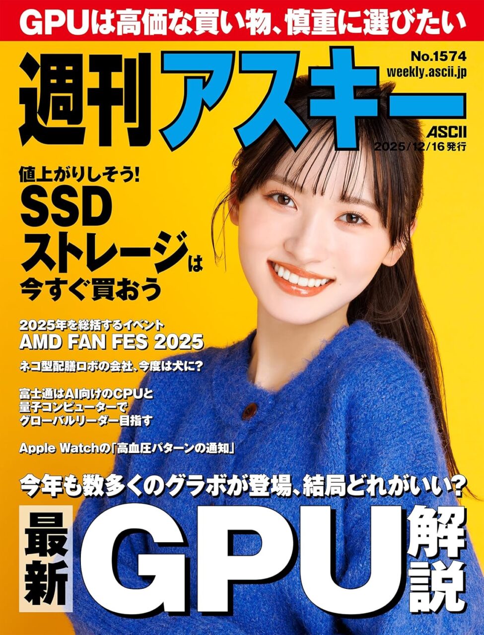 【12/16発売】「週刊アスキー No.1574」表紙:桧山ありす ポストする シェアする LINEで送る 更新日 : 2025年12月16日(火) 週刊アスキー 角川アスキー総合研究所 週刊(毎週月曜日) 公式サイト 公式SNS ▼バックナンバー検索 Amazon 楽天ブックス 週刊アスキー No.1574表紙桧山ありす特集最新GPU解説ストレージは今すぐ買う Kindle版(電子書籍)楽天Kobo版(電子書籍) 電子書籍版を購入 販売期間や在庫状況により、リンク先のショップで購入できない場合があります。ご了承ください。