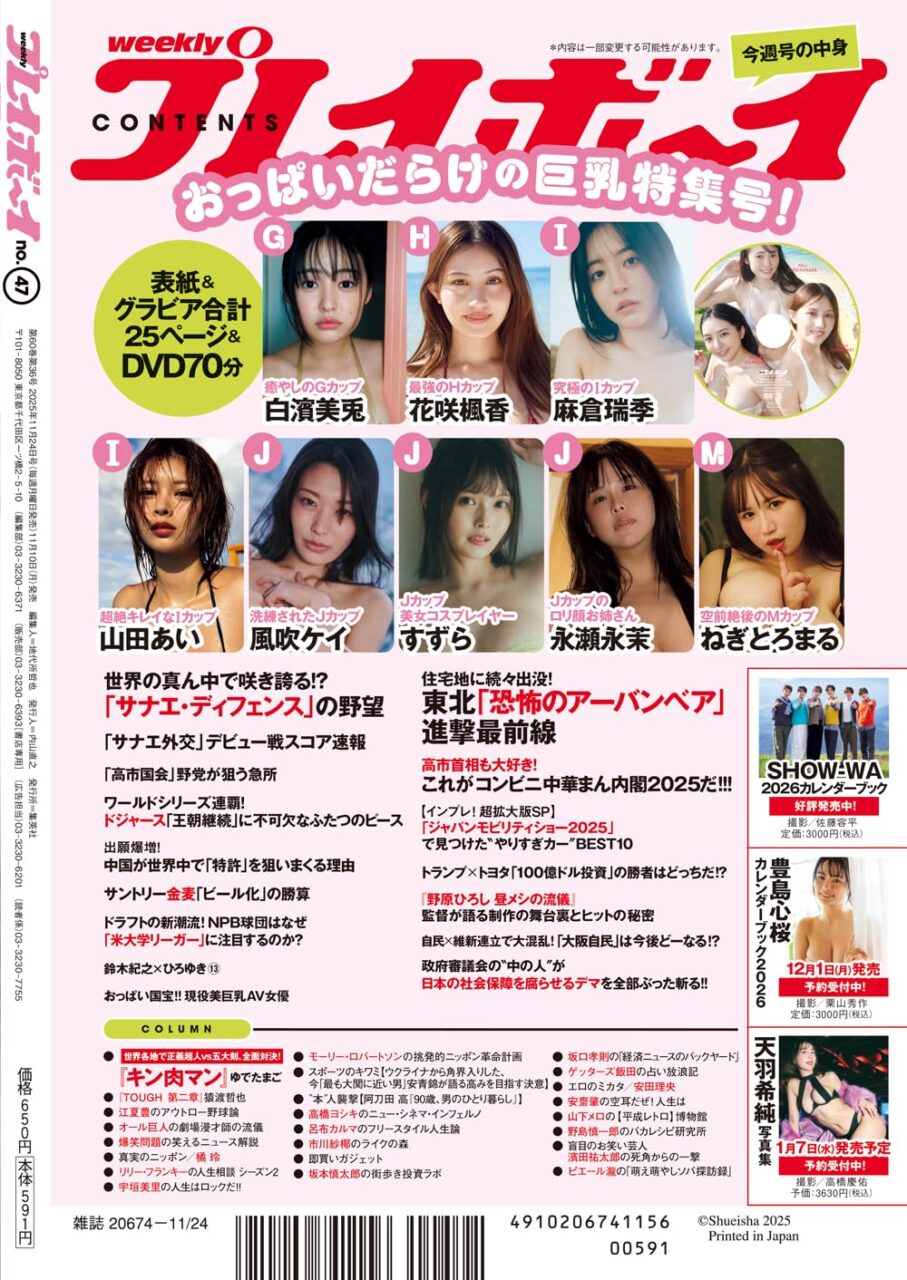 amazon.co.jp 【11/10発売】「週刊プレイボーイ 2025年 No.47」表紙:花咲楓香 × 麻倉瑞季 × 白濱美兎 ポストする シェアする LINEで送る 更新日 : 2025年11月8日(土) 週刊プレイボーイ 集英社 週刊(毎週月曜日) 公式サイト 公式SNS ▼バックナンバー Amazonで検索 楽天ブックスで検索 楽天市場で検索 週刊プレイボーイ 2025年 11/24号 No.47表紙・グラビア25P・DVD70分花咲楓香 × 麻倉瑞季 × 白濱美兎グラビア山田あい風吹ケイすずら永瀬永茉ねぎとろまる Amazonで見るKindle版(電子書籍)楽天ブックスで見る楽天市場で見る 紙版を購入 電子書籍版を購入 販売期間や在庫状況により、リンク先のショップで購入できない場合があります。ご了承ください。