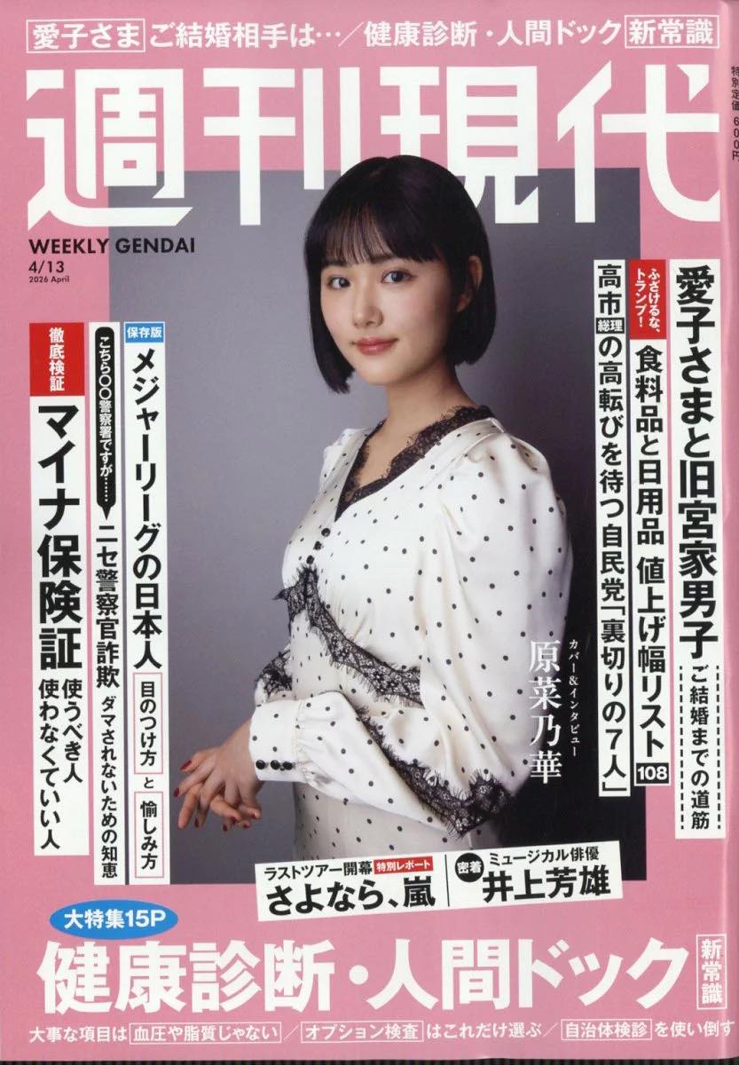 amazon.co.jp 【3/30発売】「週刊現代 2026年 4/13号」表紙:原菜乃華 ポストする シェアする LINEで送る 更新日 : 2026年3月29日(日) 週刊現代 講談社 隔週刊(隔週月曜日) 公式サイト 公式SNS ▼バックナンバー検索 Amazon 楽天ブックス 楽天市場 週刊現代 2026年 4/13号表紙&インタビュー原菜乃華 Amazonで見る楽天ブックスで見る楽天市場で見る 紙版を購入 販売期間や在庫状況により、リンク先のショップで購入できない場合があります。ご了承ください。